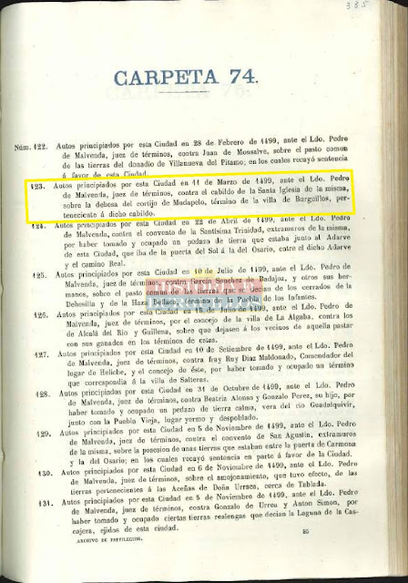 123. Autos principiados por esta Ciudad en 11 de Marzo de 1499, ante el Ldo. Pedro de Malvenda, juez de términos, contra el cabildo de la Santa Iglesia de la misma, sobre la dehesa del cortijo de Mudapelo, término de la villa de Burguillos, perteneciente á dicho cabildo.